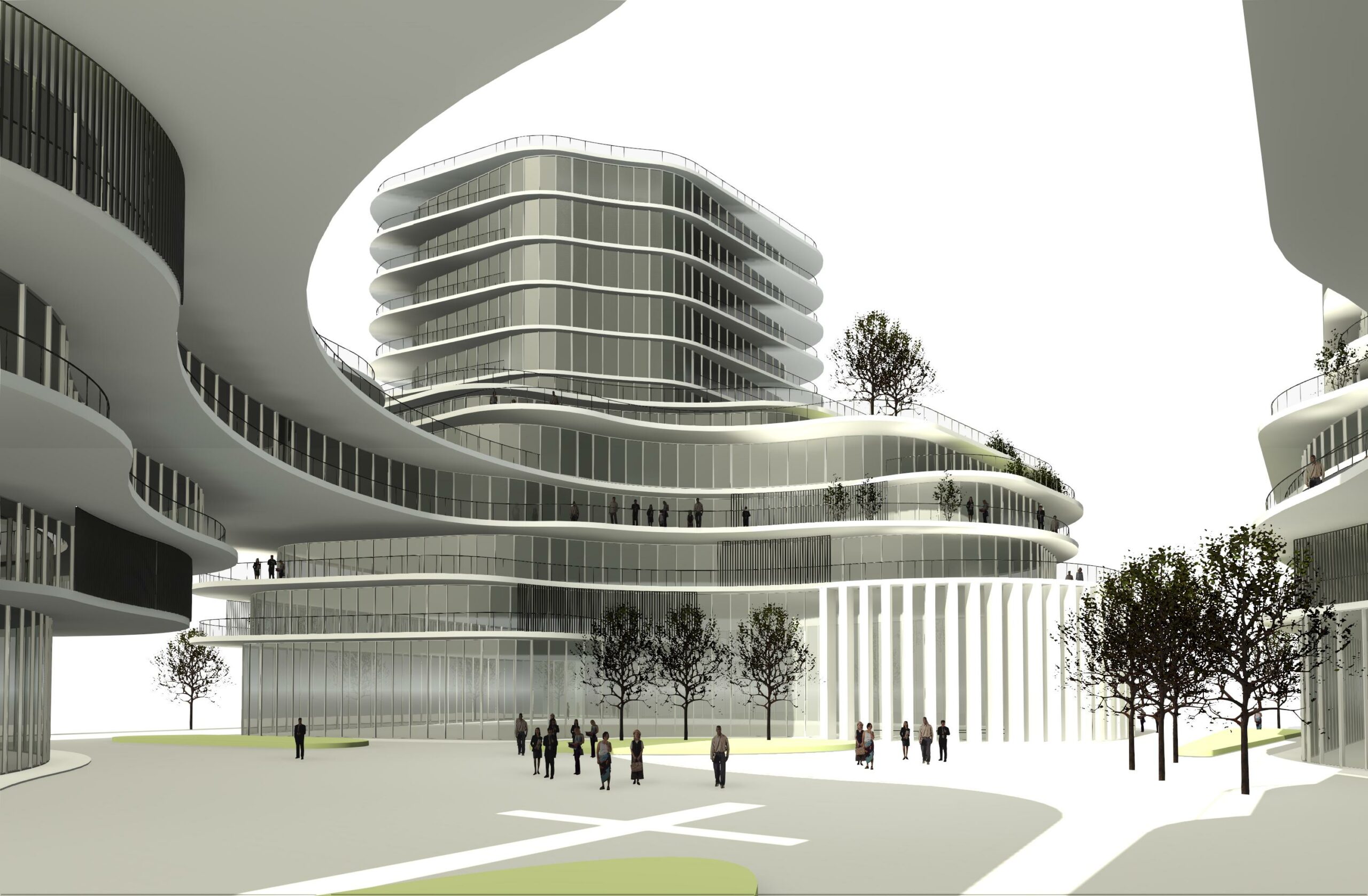 A large public plaza anchors the ground level, surrounded by curved podium terraces, transparent retail frontage, and elevated walkways. This creates a vibrant community space that supports gathering, circulation, and everyday urban activity.