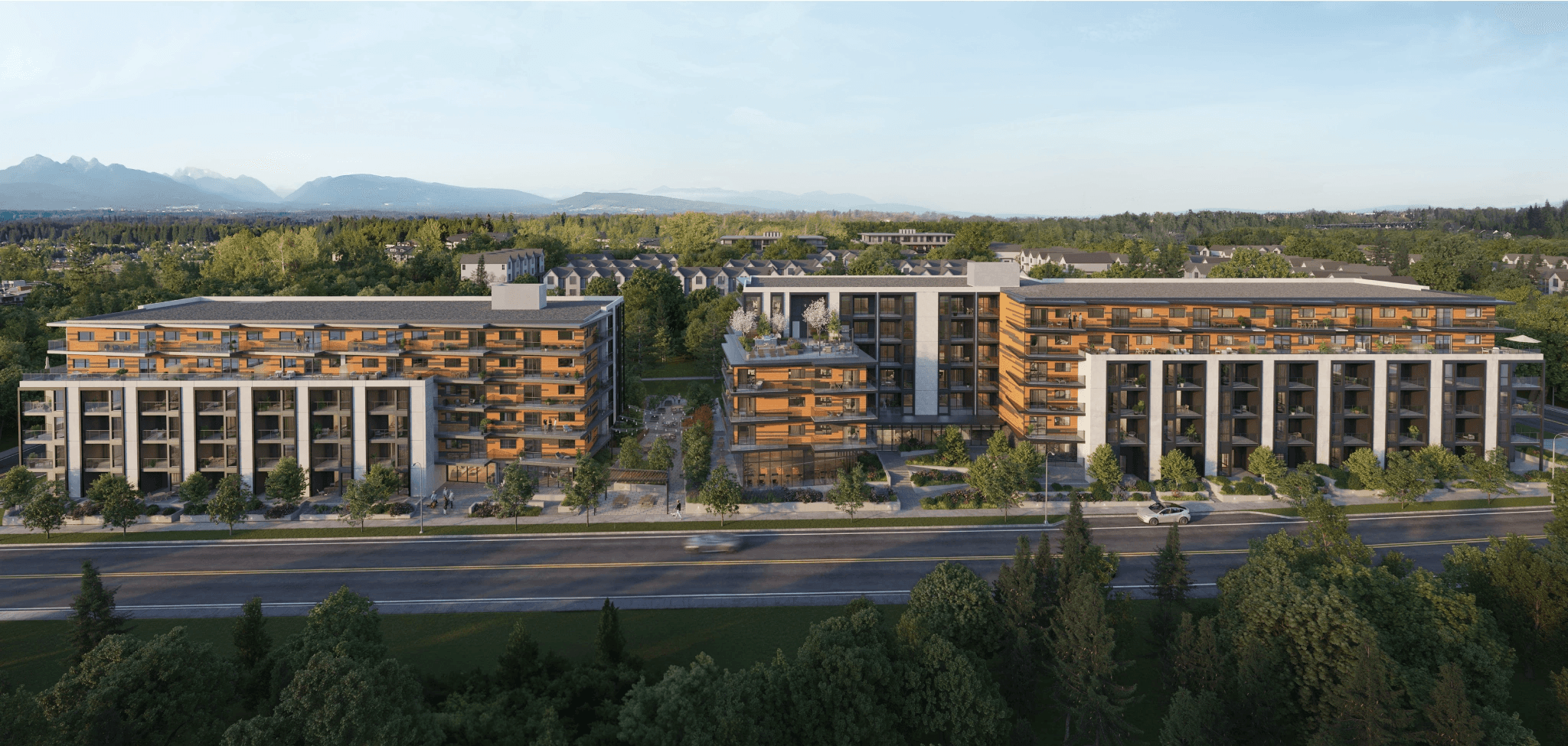 Azure Grove is structured as a mid-rise form that bridges low-rise residential fabric and future urban growth. Massing, step-backs, and façade articulation are carefully calibrated to maintain a human scale at street level while achieving density aligned with Carvolth’s long-term development vision.