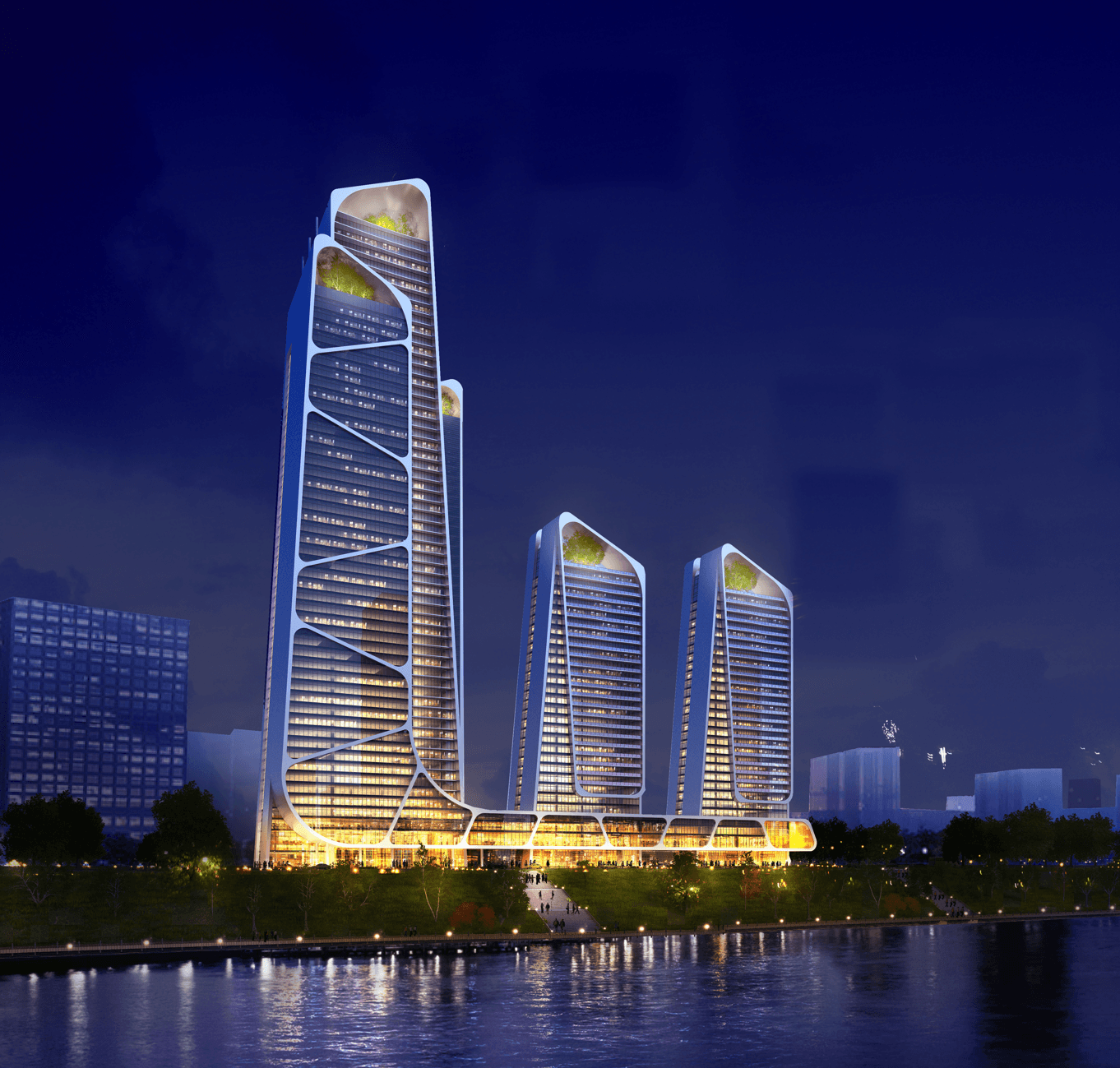 The towers are unified by a continuous white architectural frame and sculpted edges that soften their mass and emphasize verticality. Layered glazing and diagonal façade articulation introduce depth and movement across the elevations, creating a dynamic presence along the riverfront. At grade, active uses and public spaces reinforce the connection to the waterfront, while landscaped terraces and elevated green spaces provide moments of relief within the high-density urban environment.