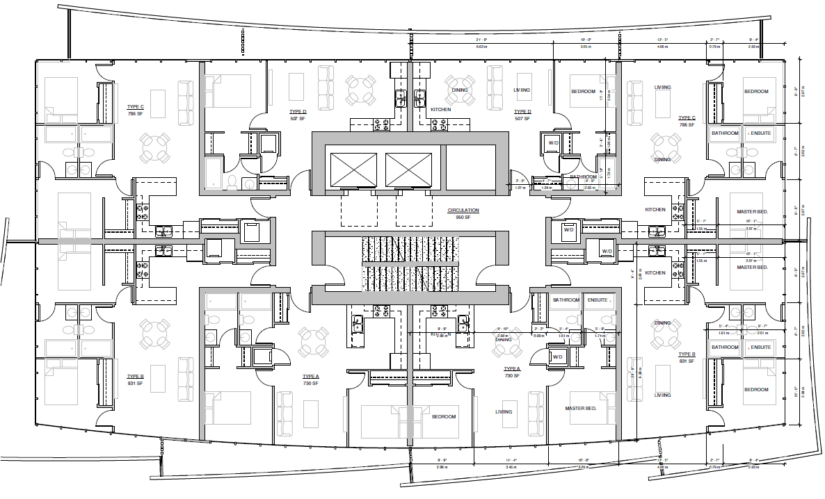 A layered podium, setbacks, and integrated landscaping soften the building’s scale at street level, balancing density with comfort, livability, and pedestrian engagement.