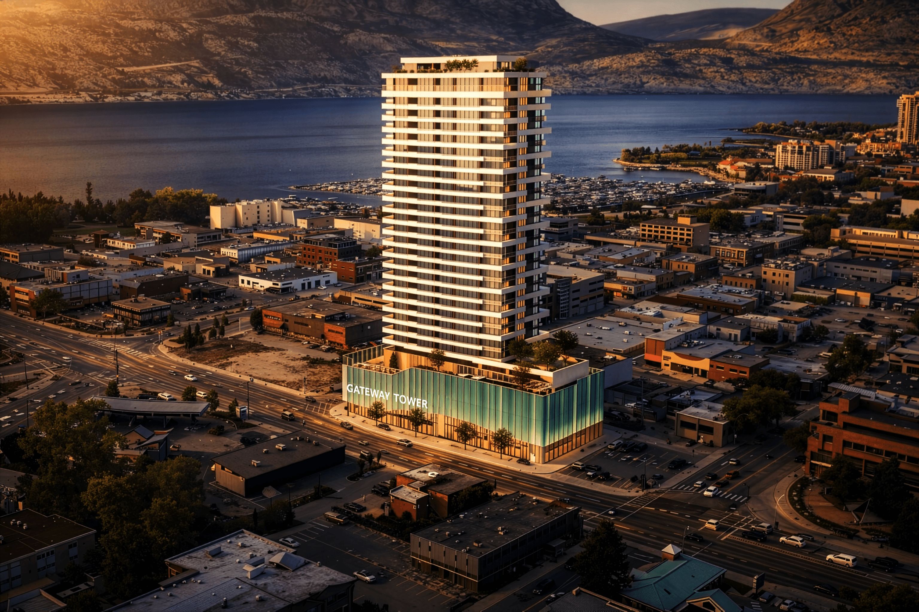 Kelowna Gateway is a high-rise mixed-use residential tower that marks a prominent urban entry point within the city. The project is conceived as a landmark building, combining a strong vertical residential form with a highly articulated podium that engages the street and frames the public realm.
