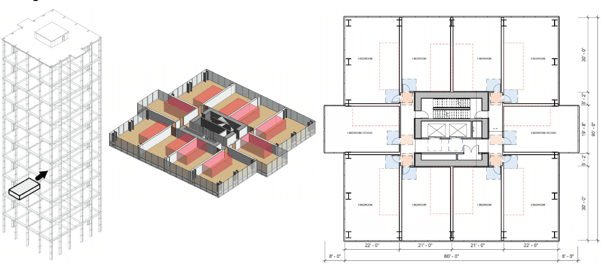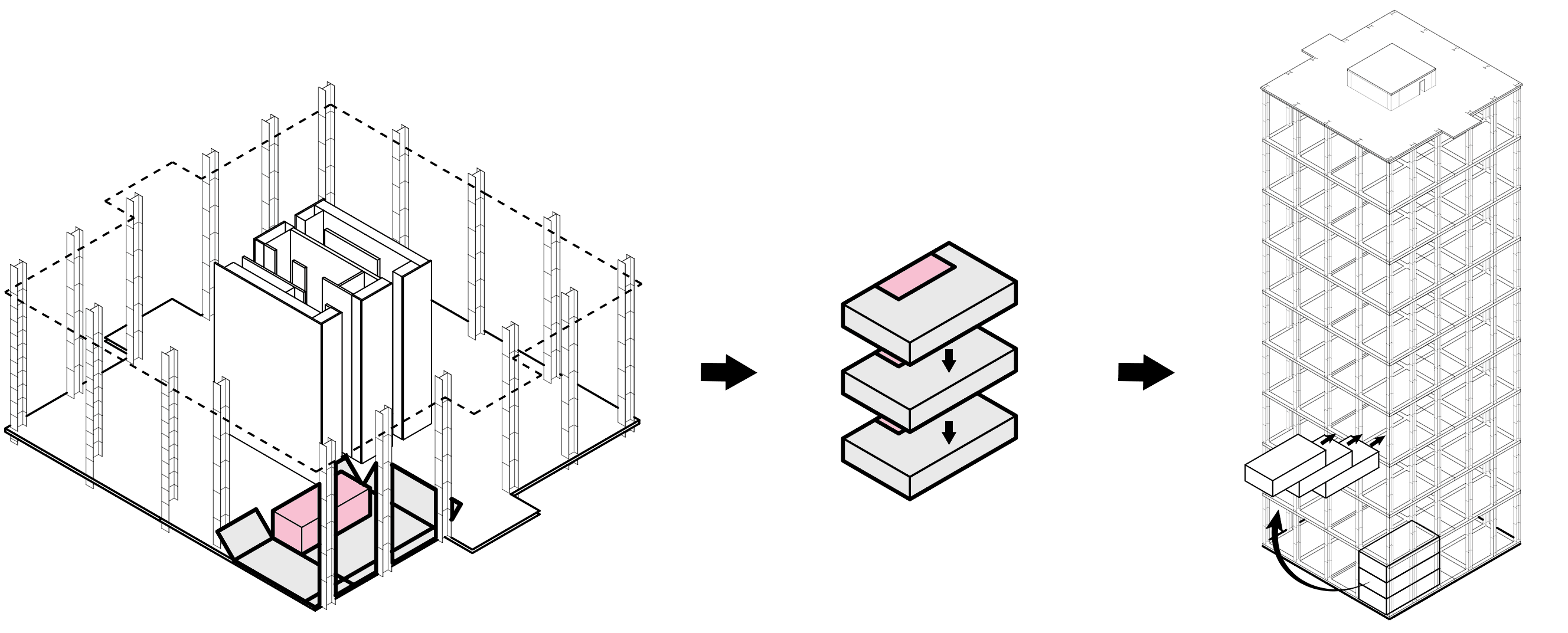 The project investigates modular stacking strategies, structural grids, and service coordination within a tower typology. Unit layouts and core organization are aligned to support prefabrication, repeatability, and efficient vertical assembly while allowing flexibility in unit mix and program.